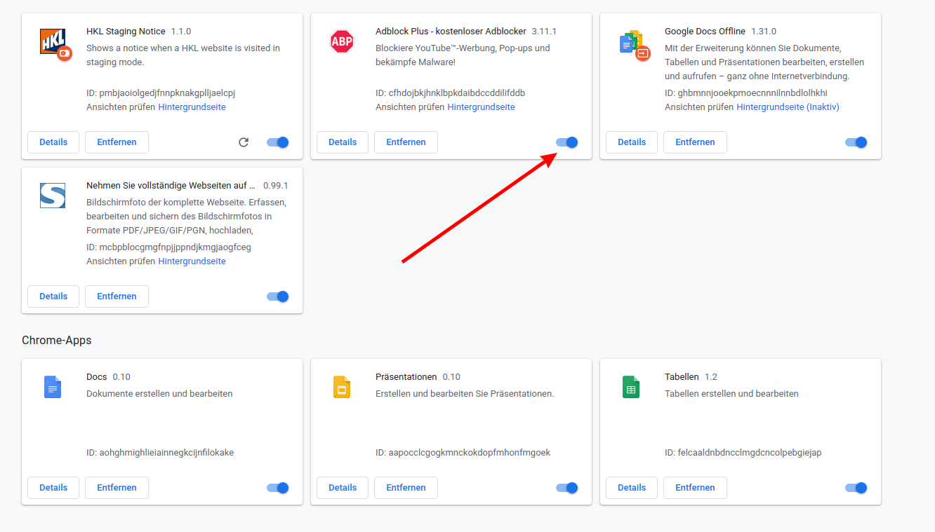 Now you will see your installed extensions. Find your adblocker and move the blue dot of the bar to the left.